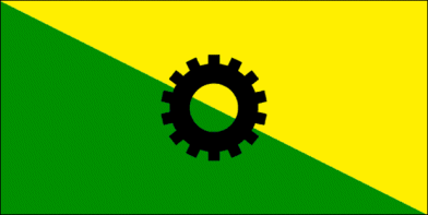 Bandiera di Dosquebradas, subito a nord di Pereira, adottata il 5 aprile 1983. Drappo tagliato in due triangoli giallo e verde. Il giallo sta per le ricchezze del territorio, il verde rappresenta la sconfinata speranza della gente, e il patrimonio naturale fatto di montagne e strette valli torrentizie (dos quebradas = "due torrenti"). L'ingranaggio nero al centro simboleggia lo sviluppo industriale. Proporzioni 1/2.