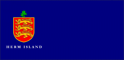 Bandiera dell'isola di Herm, tre miglia a est di Guernsey, in uso negli anni 1950 e 1951. Proporzioni circa 5/11. Vicino all'asta lo scudo di Guernsey, tre leopardi d'oro in campo rosso, sormontato dal germoglio (Guernsey sprig) in verde, e sotto il nome dell'isola (disegno ricostruito). Herm appartiene a Guernsey, che la acquisì dalla Corona nel 1945; è autonomamente amministrata da privati dietro pagamento di un affitto al governo.