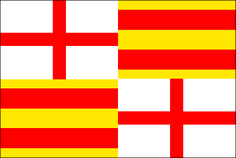Bandiera adottata dal comune di Barcellona il 3 maggio 1906. Quarti alterni con la croce di San Giorgio - santo protettore della Catalogna e particolarmente onorato a Barcellona - e i pali giallo-rossi aragonesi. L'origine è antica: sigilli e vessilli così inquartati sono noti dal secolo XIV. Dal 1906 in poi la bandiera fu usata solo saltuariamente. A partire dagli anni '40 del secolo scorso, appare una versione non ufficiale con le strisce orizzontali, ottenuta sovrapponendo i quarti con la croce alla bandiera catalana. Dopo un periodo di caos vessillologico (1996-2004), il 19 aprile 2004 la bandiera del 1906 è di nuovo ufficiale. Proporzioni 2/3.Bibliografia - Banderas, 67/68, 1998; 71/72, 1999; 92, 2004; 102, 2007 - Flag Bull., 173, 1997 - A. Duran, Atti XIV Congr. Intern. Vessill.., Barcellona 1991 - S. Herreros, Atti XXI Congr. Intern. Vessill., Buenos Aires, 2005