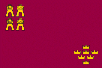 Bandiera stabilita dal consiglio regionale il 26 marzo 1979 e adottata ufficialmente con legge del 9 giugno 1982. Proporzioni 2/3. Il rosso porpora (rosso "Cartagena") rappresenta una mediazione tra due progetti originari, uno di campo rosso e uno di campo azzurro, entrambi col medesimo disegno (le corone erano al centro e i castelli agli angoli del drappo). Le sette corone - presenti anche sullo stemma dell'omonima città - simboleggiano il remoto passato di regno indipendente e attestano la fedeltà ai re castigliani; esse comparivano di diritto sugli antichi sigilli di Murcia, le prime cinque concesse nel 1291 da re Alfonso X il Saggio, la sesta nel 1361 da Pietro il Crudele e la settima nel 1709 da Filippo V. I castelli - simbolo molto comune in Spagna - rappresentano i quattro confini della comunità, Andalusia, Castiglia, Valencia e Mar Mediterraneo, che si traducono in altrettanti orizzonti culturali (arabo, mediterraneo, cristiano e levantino).